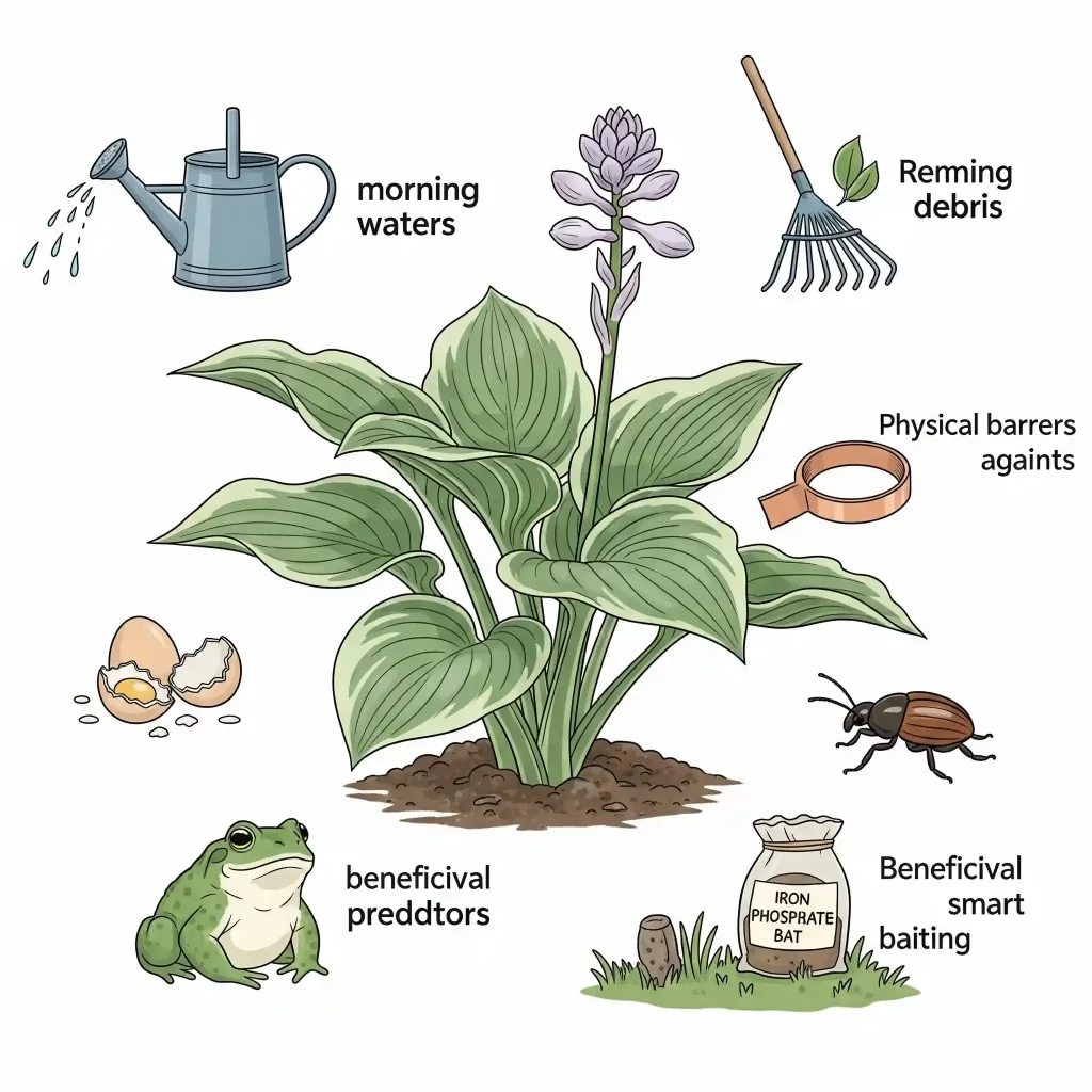 A conceptual image demonstrating a comprehensive Integrated Pest Management (IPM) strategy for slug control around hostas. It visually combines several defensive layers: proper cultural practices like morning watering and clearing debris, physical barriers such as crushed eggshells or copper tape, the encouragement of natural predators like toads, and the strategic use of pet-safe iron phosphate bait, illustrating a holistic approach to keeping hostas slug-free.