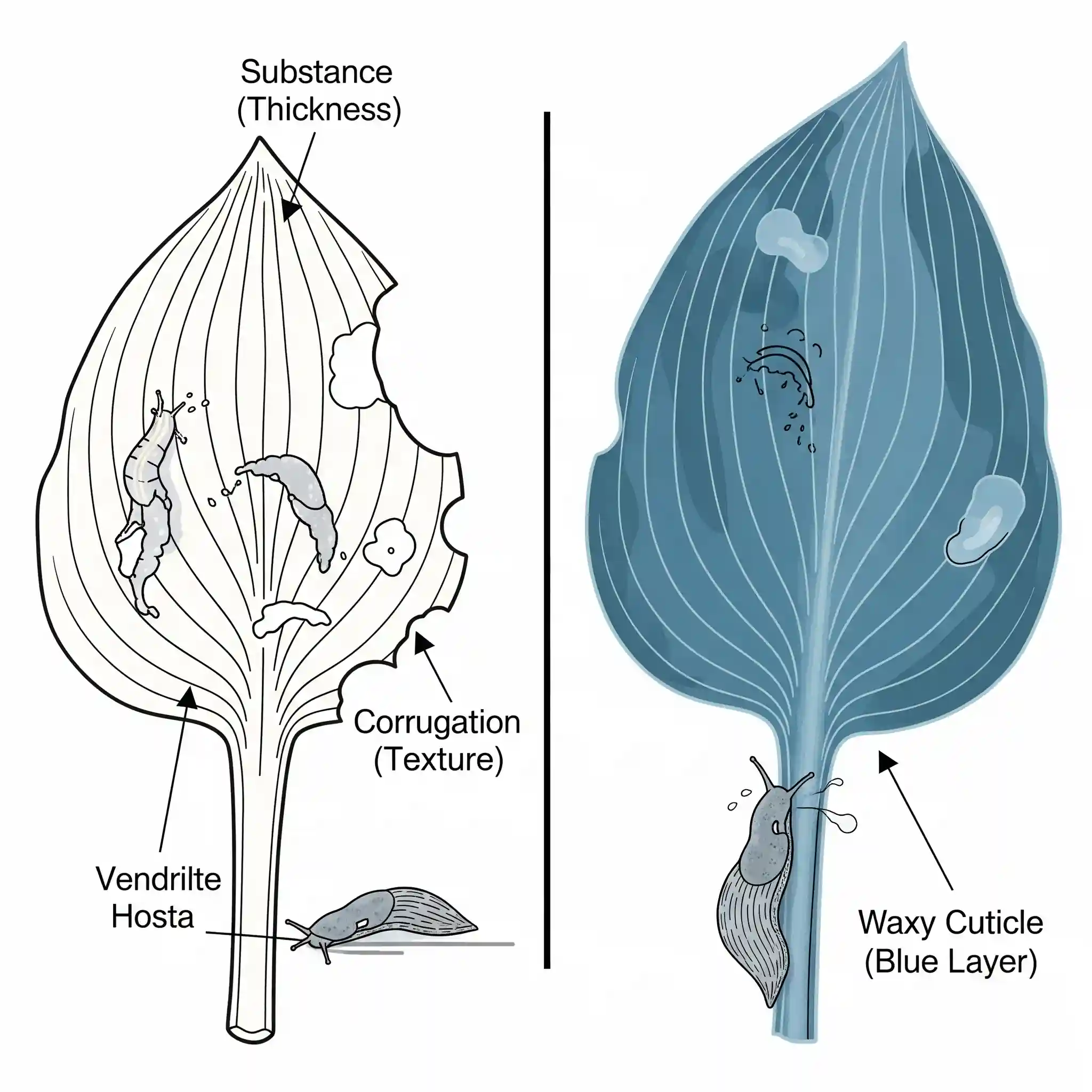A scientific illustration comparing two hosta leaves to explain slug resistance. On one side, a slug easily damages a thin leaf. On the other, a slug struggles with a hosta leaf exhibiting three key defensive traits: high substance (thickness), pronounced corrugation (texture), and a waxy blue cuticle (bloom). This visual clearly explains the botanical reasons why certain hosta varieties are naturally slug-proof.