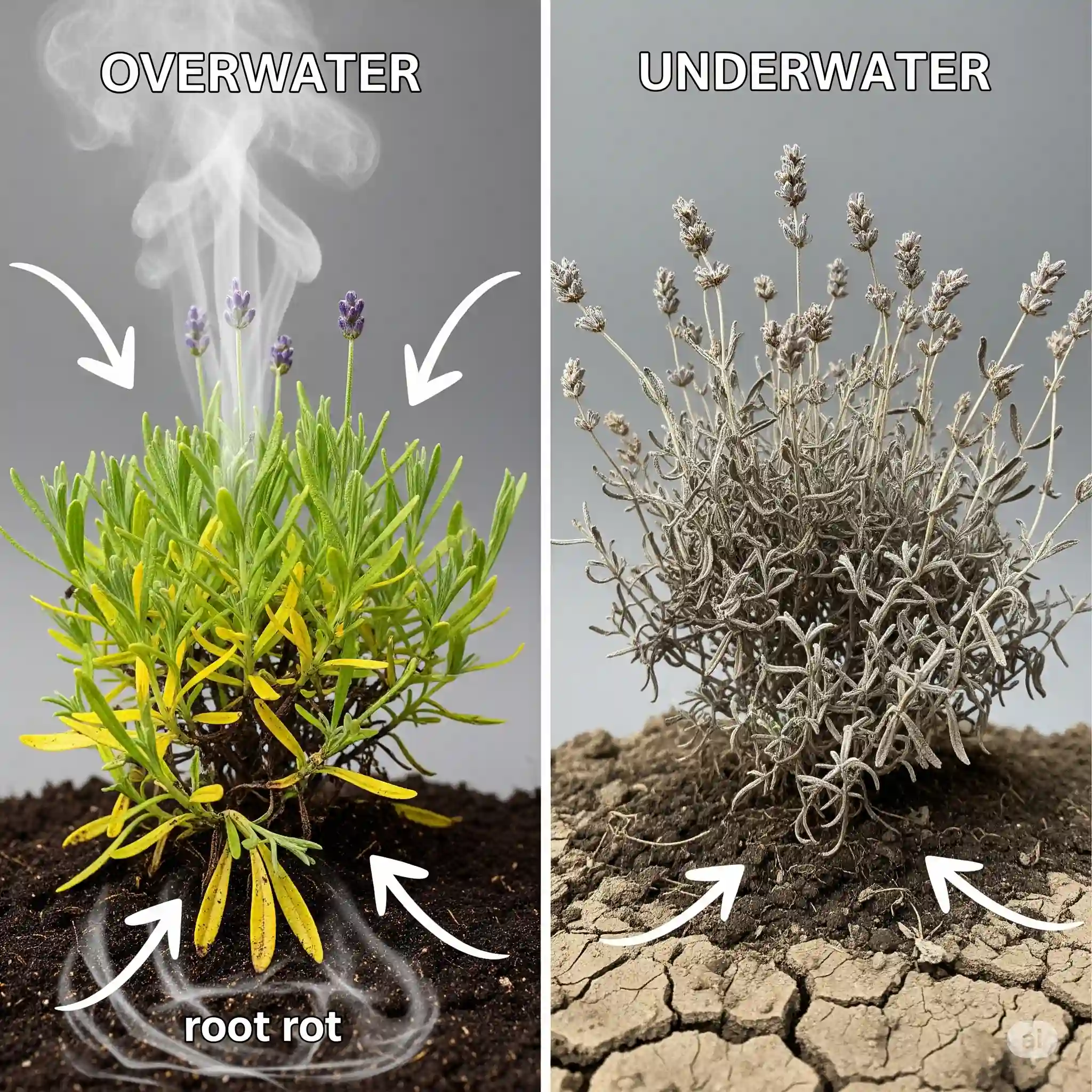 Diagnostic side-by-side: Overwatered lavender (yellow lower leaves, soft stems, wet soil with musty steam) vs. underwatered (crispy top leaves, parched soil, drooping new growth). Arrows highlight key differences for accurate problem identification.