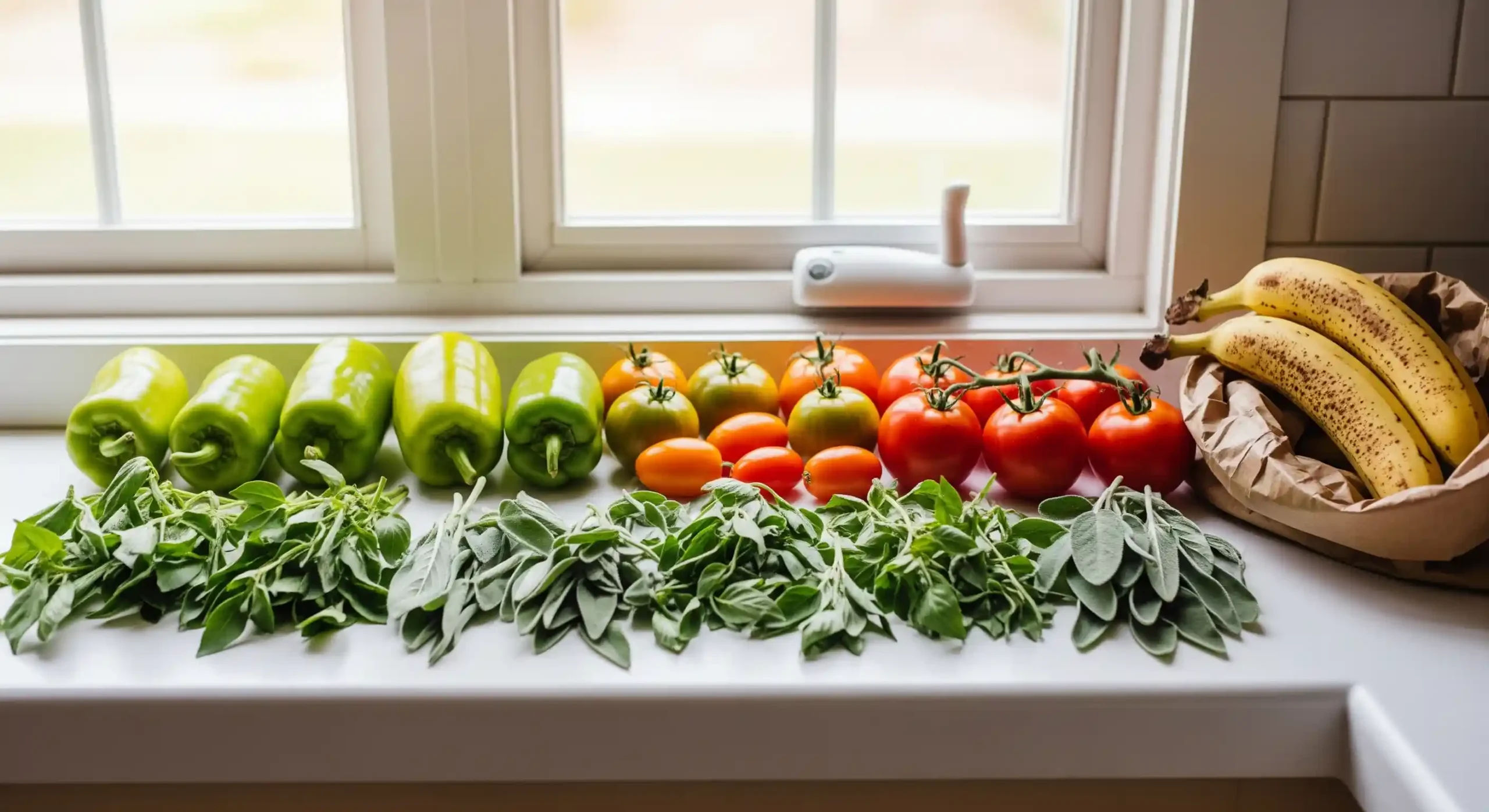 A collection of fresh produce is arranged on a white countertop in front of a window. From left to right, there are five light green bell peppers lying horizontally, followed by several bunches of green basil leaves. Next to the basil, there are six small orange tomatoes, then six larger orange tomatoes, and finally, a cluster of six ripe red tomatoes still attached to their vine. To the right of the red tomatoes, there are several silvery-green sage leaves laid out. Behind the vegetables, on the right side of the frame, three yellow bananas with brown spots rest in a brown paper bag. The countertop is bright white and reflects some of the light from the window behind. The window has white frames and multiple panes. Outside the window, a blurry view of greenery and lighter areas can be seen. Above the produce, attached to the window frame, is a small white electronic device with a short antenna. The background also shows a section of a light-colored tiled wall to the right of the window. The lighting in the scene appears to be natural daylight coming from the window, casting soft shadows.