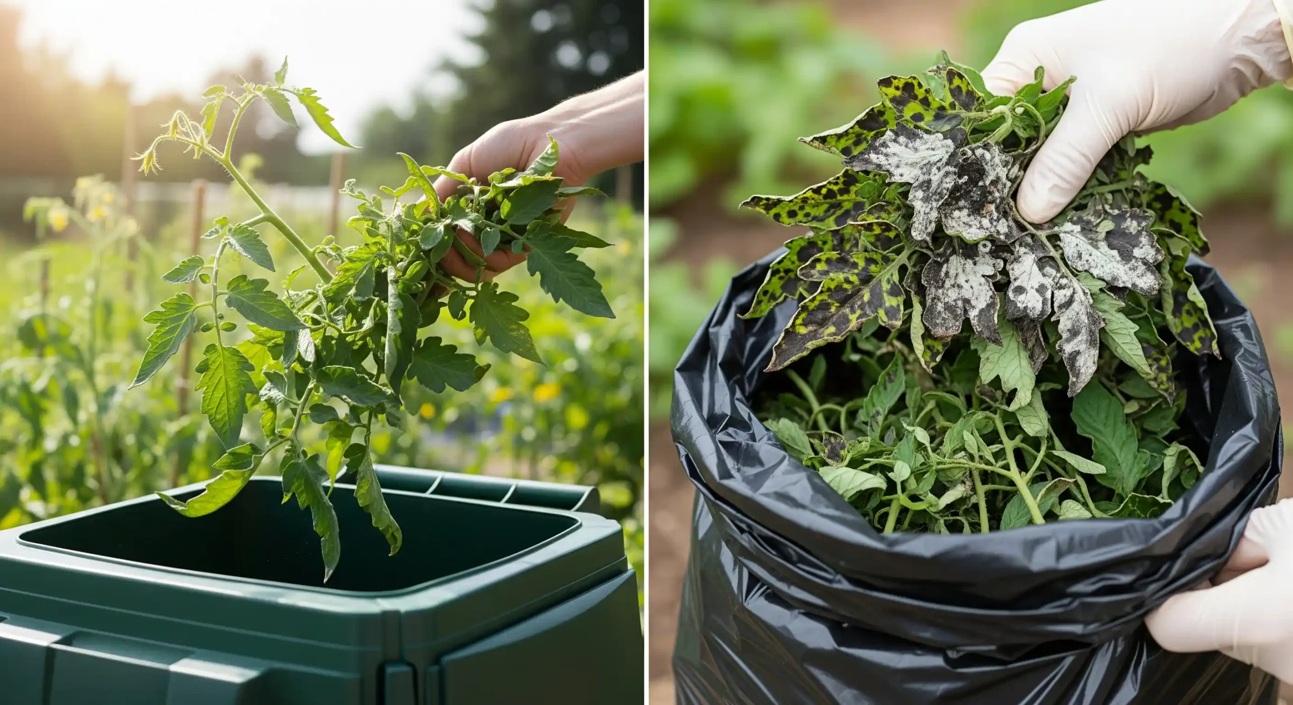 A two-panel image shows the disposal of diseased tomato plant leaves.In the left panel, a close-up captures a fair-skinned hand holding a wilted tomato plant by its stem and leaves, positioned above a dark green compost bin. The plant has several stems extending upwards and to the left, with numerous green leaves that show signs of wilting and yellowing. Some small yellow flowers or buds are visible at the top of the plant. The hand is light-skinned and holds the stem firmly. The compost bin is dark green with horizontal ridges and a slightly open lid, revealing a dark interior. The background is blurred but shows a sunny outdoor garden setting with green plants and trees. Sunlight appears to be coming from the upper left, casting soft shadows.In the right panel, a close-up shows two fair-skinned hands wearing white gloves, holding a bunch of severely diseased tomato plant leaves over a black plastic trash bag. The leaves are green but heavily marked with large, irregular black and dark brown spots. Some of the leaves are also covered with patches of white or gray mold. The hands hold the diseased foliage above the open top of the black trash bag, which is partially filled with more discarded green plant matter. The background is out of focus but suggests an outdoor garden with soil and green foliage. The lighting is soft and diffused.